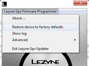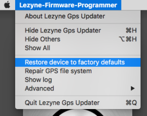 6. Ga in het programma naar het vervolgkeuzemenu. In Windows heeft het programma het menu in de rechterbovenhoek, hier staat ‘Lezyne GPS Firmware Programmer’. Op een Mac bevindt zich het vervolgkeuzemenu zich naast het Apple-logo in de rechterbovenhoek van uw scherm, hier staat Lezyne-Firmware-Programmer.