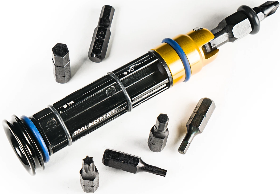 De Tool Insert Kit is een gereedschapsset voor machinaal bewerkte aluminium bar plugs. De set is gemaakt van gefreesd aluminium. Het gereedschap wordt veilig en discreet ingebracht als een bar plug. Gemakkelijk weg te steken in je stuur.